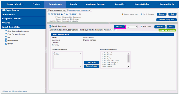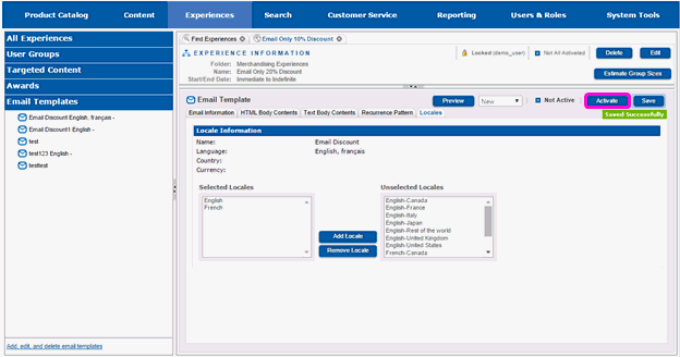 Select a locale in the Selected Locales text box, then select Remove Locale to invalidate the email template in that locale..