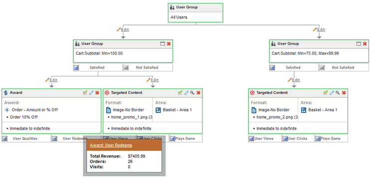 The body of the page is where experiences are created. Selections from the sliding panes are dragged into this area and connected to other items that have been dragged in. A non-editable All users user group always displays in the body as a starting point for all experiences. Analytic information is displayed for each experience node when the mouse is hovered over the analytics icon ().
