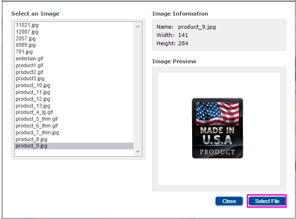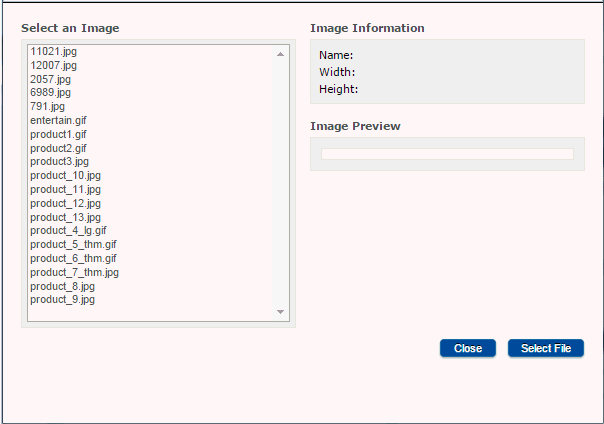 The file selection window is used to select the file that will be attached to the product. A list of all of the files that are available for the chosen file type will be displayed.