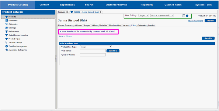 The page will redraw and you will see a message indicating that the file has been saved with the product.
