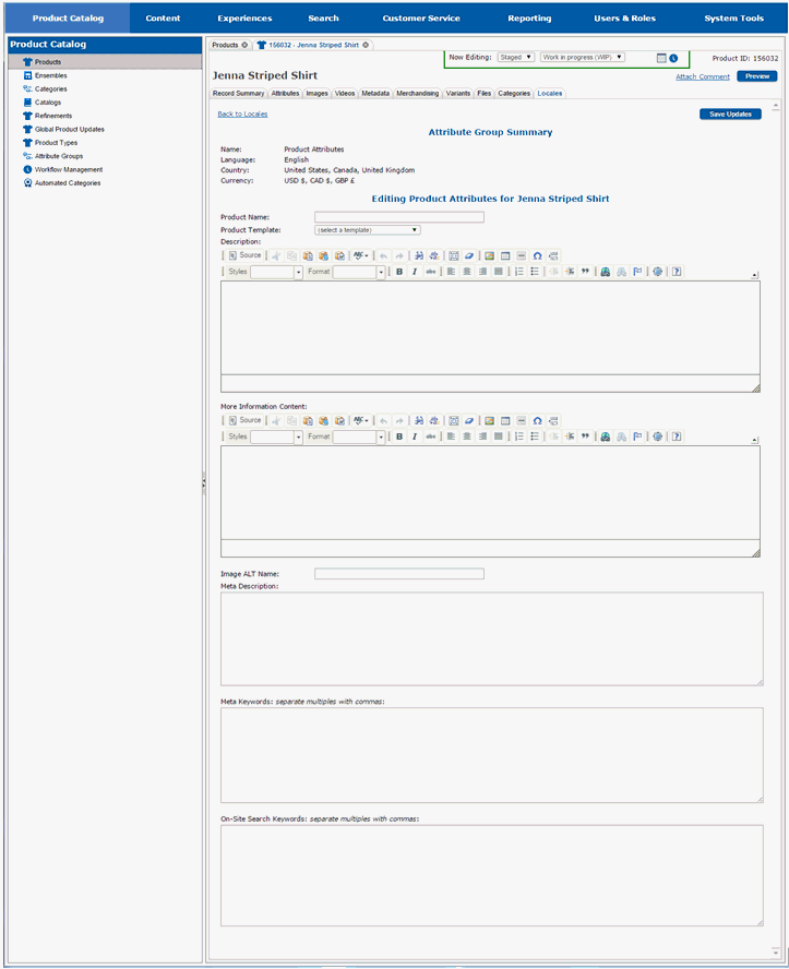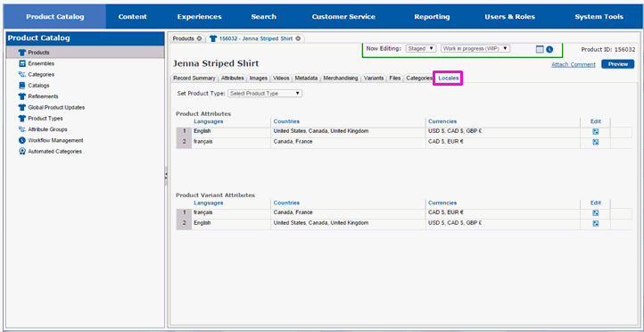 There are three things that can be customized by locale for a product: product attributes, product variant attributes, and dynamic attributes. Customizations are done by determining the category of changes you want to make, and then selecting the locale(s) in the appropriate list for the category. We will first make product attribute changes.