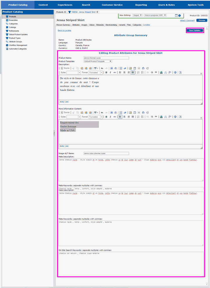 You will modify the product's variant attributes for each locale next.