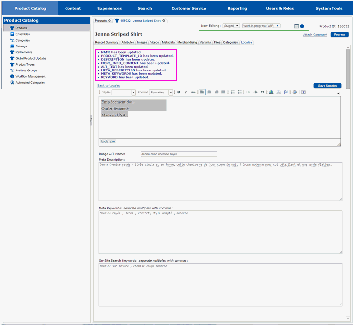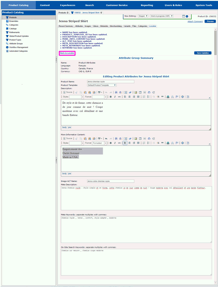 The page will redraw and you will be returned to the main Locales tab. Repeat editing the product attributes for each locale that you want to make customizations for.