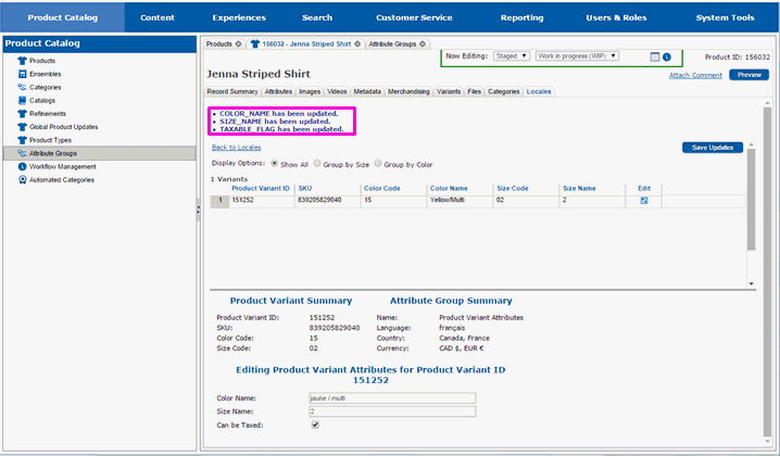 The page will redraw and you will be returned to the main Locales tab. Repeat editing the product variant attributes for each locale that you want to make customizations for.