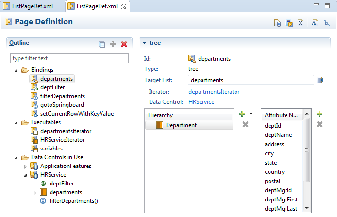 「データ・コントロール」ウィンドウを初めて使用してページにコンポーネントを追加する際には、OEPEによって、そのページのページ定義ファイルが自動的に作成され、コンポーネントが参照する各バインディング・オブジェクトの定義が自動的に追加されます。それ以降、ページにデータバインド・コンポーネントを追加するたびに、OEPEによって、必要なバインディング・オブジェクト定義がページ定義ファイルに自動的に追加されます。