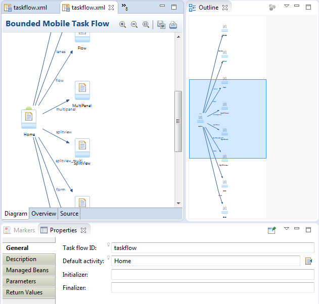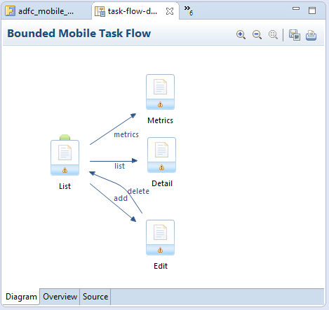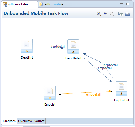 パレットで、タスク・フロー要素をドラッグしてフロー構造内に配置することで、独自のMAF AMXアプリケーション機能のバインド・タスク・フローを宣言的に作成できます。それらの要素を相互に関連付けて配置すると、OEPEは、ナビゲーションがMAF AMXアプリケーション機能で動作するために必要なXMLメタデータをtask-flow-definition.xmlファイル(デフォルト)に作成します。タスク・フロー定義ファイルのソースを編集することもできます。