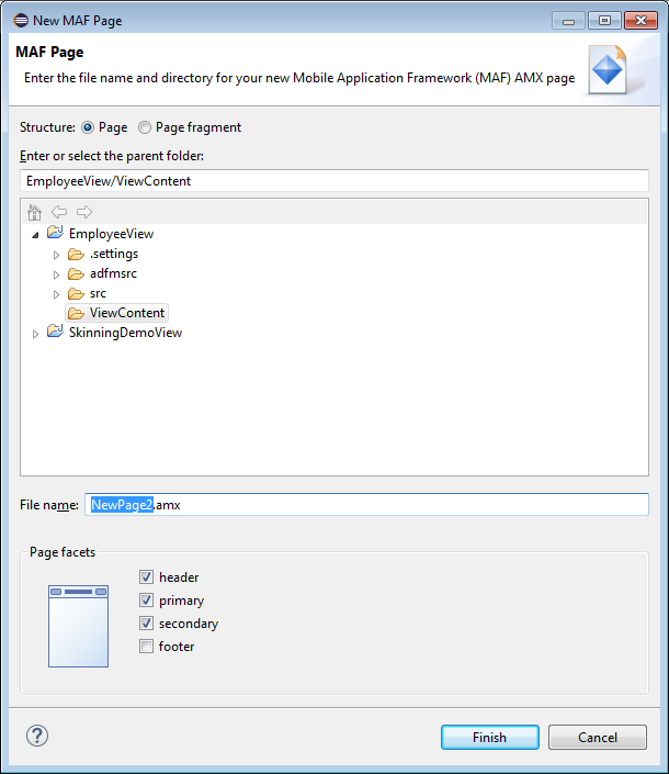 前述のとおり、ビュー・アクティビティは、メタデータで、タスク・フローへの追加時に表示される実際のMAF AMXページに関連付けられています。ビュー・アクティビティは、「パレット」からドラッグ・アンド・ドロップすることによって追加します。「ダイアグラム」ウィンドウで「ビュー」アクティビティを右クリックして実際のMAF AMXページを作成し、次に表示されるダイアログ(図12-15「新しいMAFページ作成ダイアログ」を参照)でページの特性を定義できます。