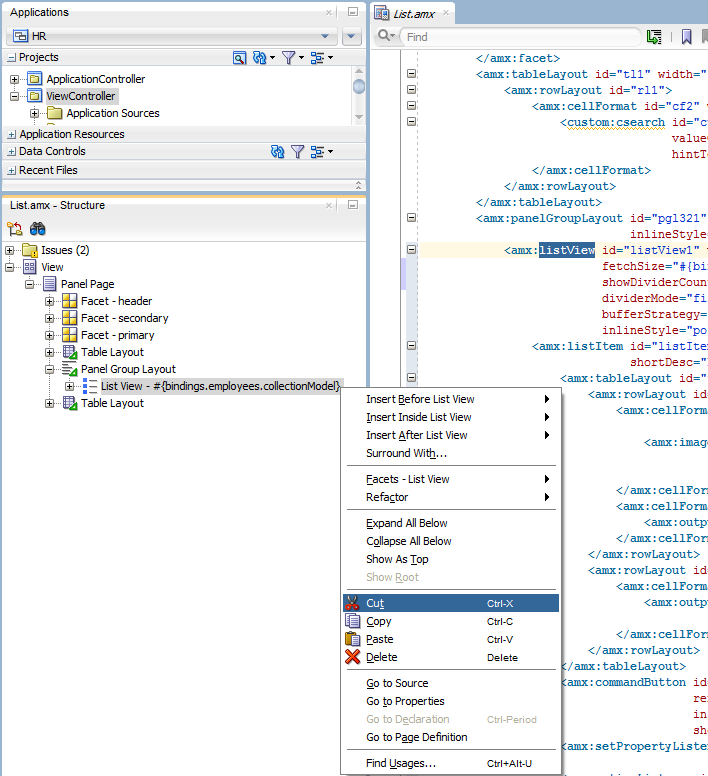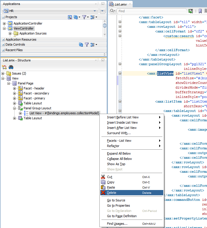図12-42は、バインディングを参照するリスト・ビュー・コンポーネントの削除を示しています。削除すると、関連するバインディング・エントリが、対応するPageDef.xmlファイルから自動的に削除されます。