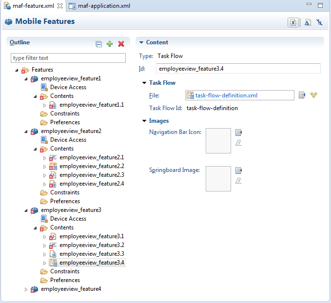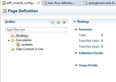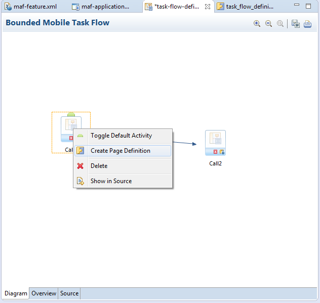 タスク・フローがすでに作成されている場合を除き、MAFは、新しいMAF AMXページが作成されると、自動的にデフォルトのバインドなしタスク・フロー(adfc-mobile-config.xmlファイル)を生成します。