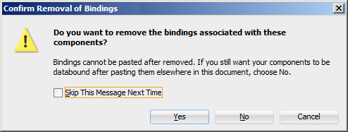 「切取り」をクリックすると、図12-44に示すような「ADFバインディングの削除の確認」ダイアログが表示され、該当するバインディングを削除するかどうかを選択するよう求められます。