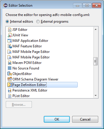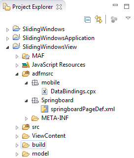デフォルトでは、ページ定義ファイルは、「ViewController」プロジェクトのApplication Sourcesノードにあるmobile.PageDefsパッケージに含まれています。対応するMAF AMXページがデフォルト以外のディレクトリ、またはデフォルトのサブディレクトリに保存されると、ページ定義も同じ名前のペッケージに保存されます。