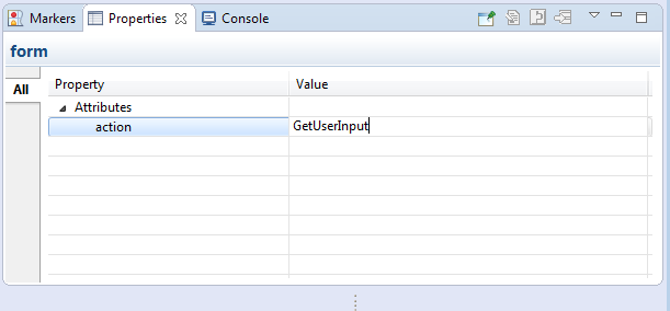 エディタの項目(または「構造」ウィンドウの関連付けられたノード)をクリックすると、「プロパティ」ウィンドウを使用してその項目の属性値を表示および編集したり、「ソース」タブをクリックしてXMLソースを直接編集できます。