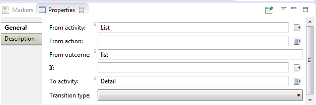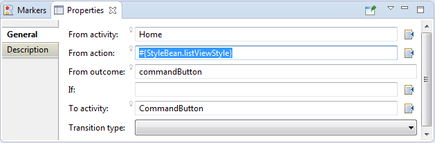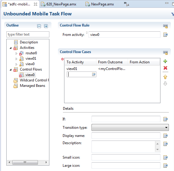 MAF AMXアプリケーション機能内で、あるアクティビティから次のアクティビティに制御を渡す方法を指定します。詳細は、第12.2.6.1項「制御フロー・ケースの定義」を参照してください。 |