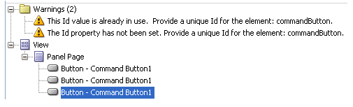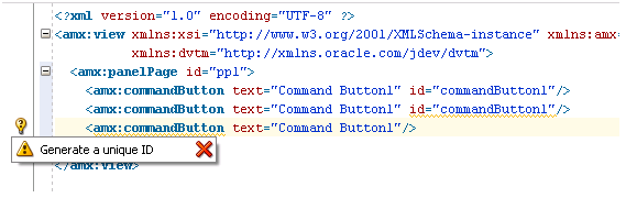 「パレット」からコンポーネントをドロップするか、データ・コントロールをドラッグ・アンド・ドロップすることにより、要素が追加されると、MAFは一意の要素識別子(id)を生成し、自動的にこれをMAF AMXページに挿入します。これにより、同じページ内の類似したコンポーネントでもそれぞれを識別する、MAF AMXページ内の有効な識別子となります。