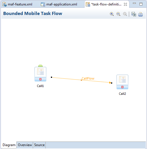 図12-2に、task-flow-definition.xmlというタスク・フロー・ファイル例を示します。このファイルでは、制御フローはタスク・フロー・コールCallFlowによってCall1からCall2に方向付けられます。(第12.2.7項「「戻る」ナビゲーションのMAFサポートに関する必知事項」を参照)。