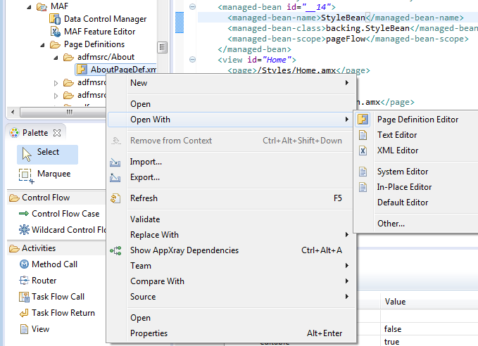 独自のアプリケーション機能のバインド・タスク・フローを作成するには、MAF AMXタスク・フロー・デザイナを使用します。このツールにはダイアグラマ(第12.2.4項「MAFタスク・フロー・ダイアグラマに関する必知事項」を参照)が含まれており、ここで、パレットからアクティビティと制御フロー(第12.2.2項「タスク・フロー・アクティビティおよび制御フローに関する必知事項」を参照)をドラッグ・アンド・ドロップすることにより、タスク・フローを構築します。その後、「プロパティ」ウィンドウを使用して、これらのアクティビティとそれらの間の遷移を定義します。