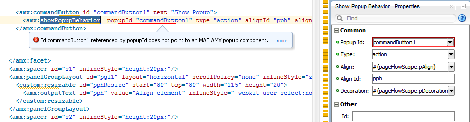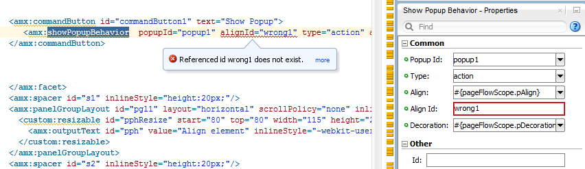 idに加え、監査ユーティリティでは「ポップアップ表示動作」操作のpopupIdおよびalignId属性をチェックします(第13.2.8項「ポップアップ・コンポーネントの使用方法」を参照)。