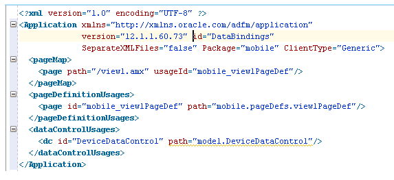 ファイルの「ページ・マッピング」(pageMap)セクションにより、IDを使用して各MAF AMXページまたはタスク・フロー・アクティビティが対応するページ定義ファイルにマップされます。「ページ定義の使用方法」(pageDefinitionUsages)セクションにより、ページ定義IDはMAF AMXアプリケーション機能のページ定義ファイルの絶対パスにマップされます。「データ・コントロールの使用方法」(dataControlUsages)セクションは、ページ定義ファイル内で定義済のバインディング・オブジェクトによって使用されるデータ・コントロールを識別します。これらのマッピングにより、ページの起動時にバインディング・コンテナを初期化できます。