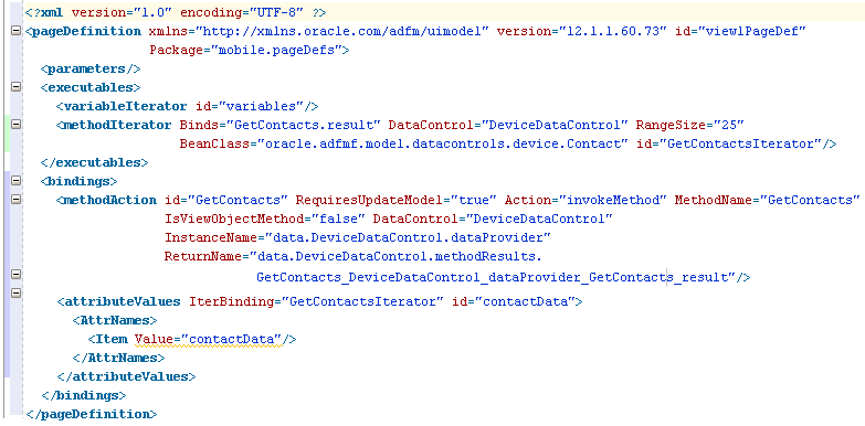 ページ定義ファイルでは、実行時にMAF AMX UIコンポーネントにデータを移入するバインディング・オブジェクトを定義します。バインディングを持つすべてのMAF AMXページには、そのページで使用するバインディング・オブジェクトの定義が含まれる、対応するページ定義ファイルが必要です。ページ定義ファイルによって、すべてのバインディングに設計時アクセスが提供されます。実行時には、ページ定義ファイルによって定義されたバインディング・オブジェクトが、ページ定義ファイルの実行時インスタンスであるバインディング・コンテナ内でインスタンス化されます。