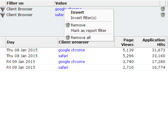 Open as export. Opens a new window in which you can further customize the currently shown data prior to exporting it to a wide variety of applications (such as Microsoft Excel). This facility is described in Section 3.11, "Exporting Data". |
