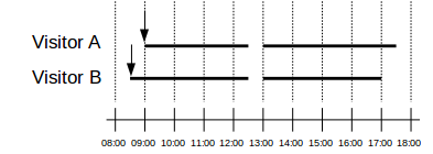 Two visitors, each working on a web application for about 8 hours during a day (Jan 2nd), with a small break around 12:30 hours.