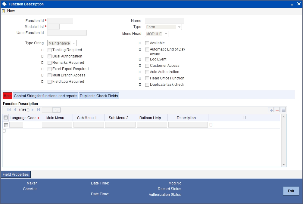 You can define the fields that need to be matched for duplication in the ‘Function Description Maintenance’ screen. You can invoke this screen by typing ‘SMDFNDSC’ in the field at the top right corner of the Application tool bar and clicking the adjoining arrow button.