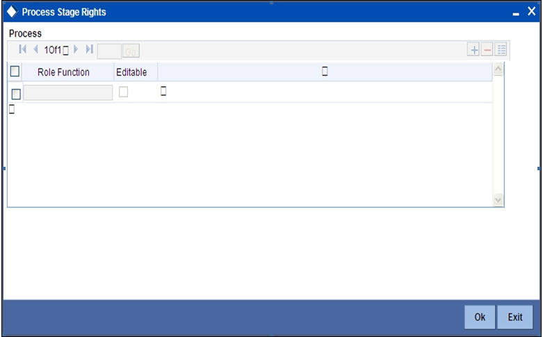You can define these rights in the ‘Process Stage Rights’ screen. To invoke this screen, type ‘SMDROLDF’ in the field at the top right corner of the Application tool bar and click the adjoining arrow button. In the ‘Role Maintenance’ screen that is displayed, click ‘Process Rights’ button. The following screen is displayed: