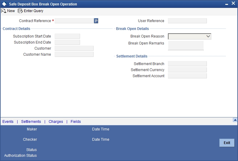 Under certain circumstances like where the customer has not paid the rental or not visited the locker for a long time, you can break open the safe deposit locker. As part of this operation, you are required to maintain certain information in the ‘Safe Deposit Box Break Open Operation’ screen. To invoke this screen, type ‘DLDBRKOP’ in the field at the top right corner of the Application Toolbar and then click the adjoining arrow button.