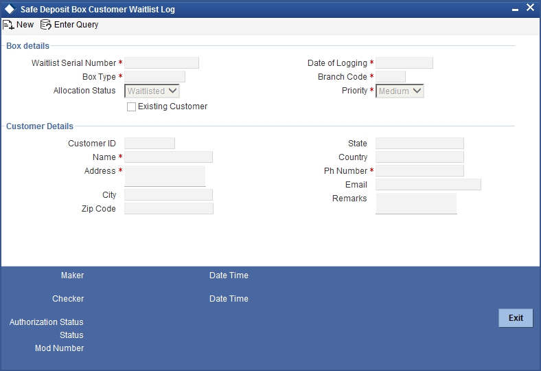 If the customer has already requested for a safe deposit box and is on the waiting list, you can enter the appropriate waitlist number here. When you authorize the locker request for the customer here, the system will change the allocation status of the waitlist to ‘Allocated’ from ‘Waitlisted’ in the ‘Deposit Lockers customer Waitlist Log’ screen.