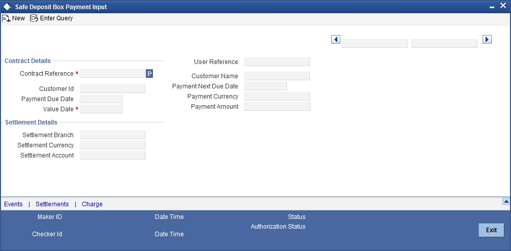 In case of manual payments, you have the option of collecting the rental either in cash or from the account of the customer. You can collect the payment from the account of the customer in the ‘Safe Deposit Box Payment Input’ screen. To invoke this screen, type ‘DLDPAMNT’ in the field at the top right corner of the Application Toolbar and then click the adjoining arrow button.
