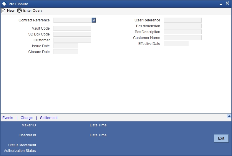 You can close contracts before the expiry date in the ‘Safe Deposit Box Pre Closure’ screen. To invoke this screen, type ‘DLDPCLOS’ in the field at the top right corner of the Application Toolbar and then click the adjoining arrow button.