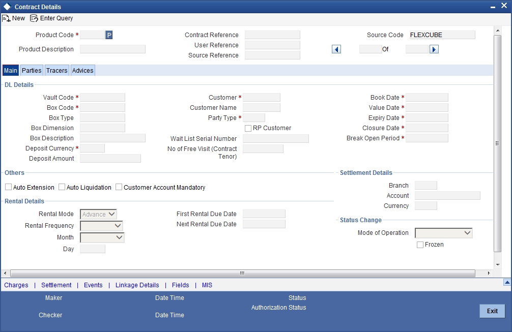 The system defaults the preference maintained at the product level. Additionally, if you have chosen the ‘Auto Extension’ or ‘Auto Liquidation’ options, this option needs to be selected. If this option is checked, then you are required to provide settlement details in the contract screen. At the time of closure of an account, the system will ensure that the account is not linked to any contract for deposit lockers.