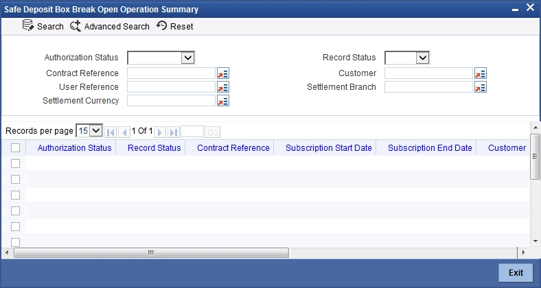 You can query and view the details of the safe deposit lockers which have been broken open in the ‘Safe Deposit Box Break Open Operation Summary’ screen. To invoke this screen, type ‘DLSBRKOP’ in the field at the top right corner of the Application Toolbar and then click the adjoining arrow button.