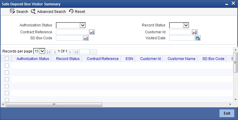 After specifying the parameters for the query, click ‘Search’. The system displays all the records matching the parameters specified. If you do not specify any parameter for the query before clicking ‘Search’, the system will display all the available records for visitors to the safe deposit lockers.