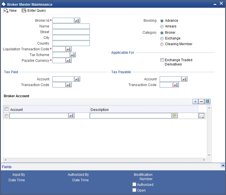 Based on the Broker ID you select, the system displays other details such as Name, Address, Street, City, and Country of the Broker from the CIF Maintenance screen.