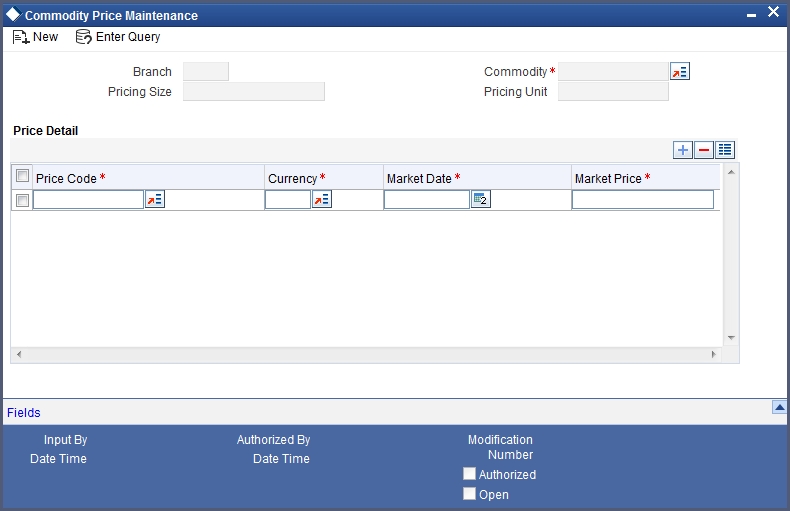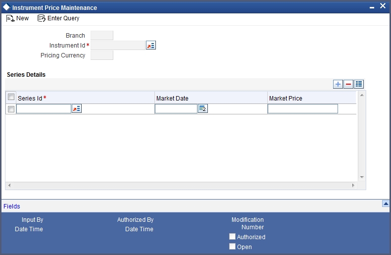 Since prices of underlying assets/commodities linked to instruments keep fluctuating based on the market conditions the prices of instruments maintained in Oracle FLEXCUBE have to be revalued on a daily basis. You should capture the revalued prices for each instrument through the ‘Instrument Price Definition’ screen.