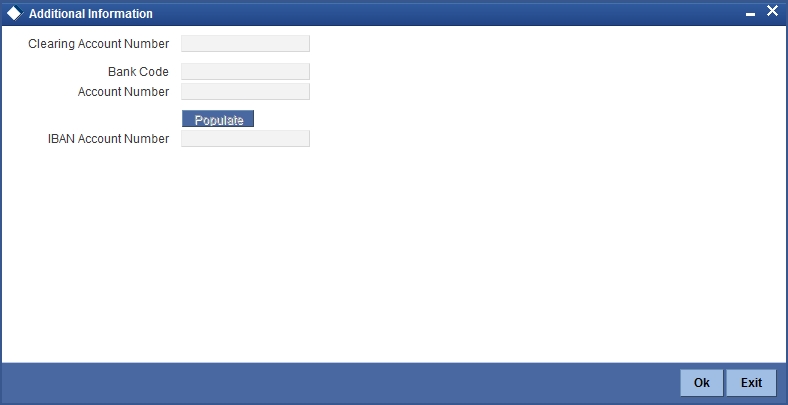Click 'Populate' button to default the IBAN Account Number based on bank code and account number. If the IBAN Number maintained for a GL is found in the incoming payment the System resolves the actual GL as per your maintenance in this screen.