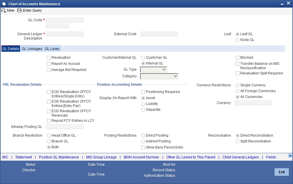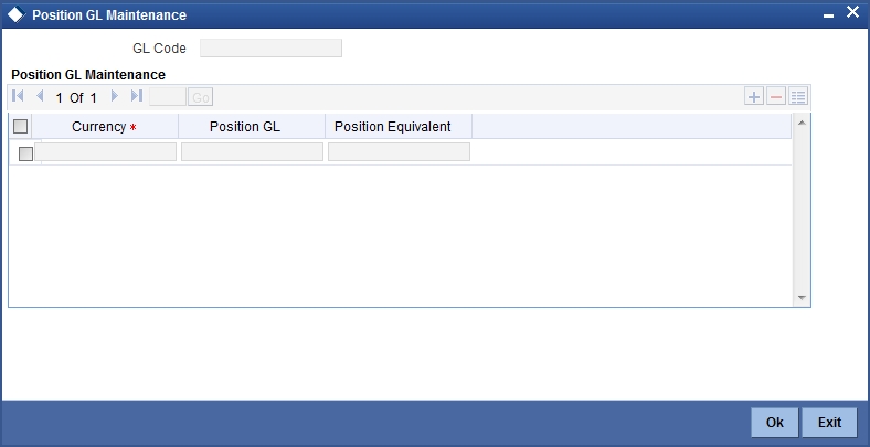 When defining a GL in the Chart of Accounts, you must link all the foreign currencies linked to a GL to a Position GL, and a Position Equivalent GL if you have opted for position accounting in the Bank Wide Parameters screen.