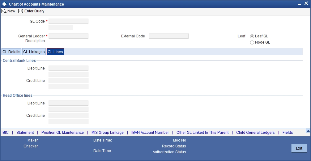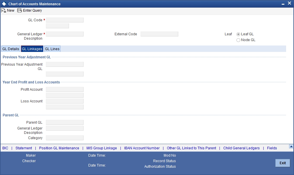 To create this new GL structure, invoke the 'Chart of Accounts' screen, the 'GL Linkages' screen is displayed. Click new icon. A new screen with no prior inputs will be invoked.