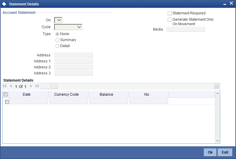 You can indicate whether a periodic statement of accounts needs to be generated for transactions involving the GL through the Statement Details sub-screen in the GL Chart of Accounts screen.