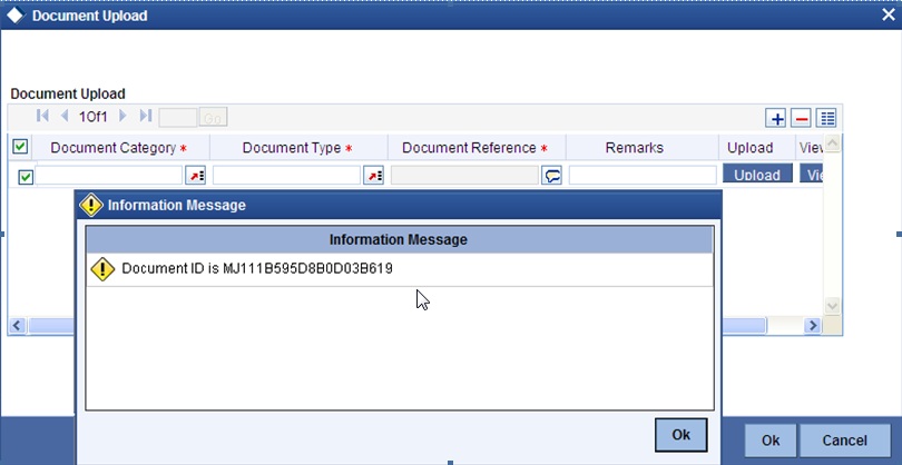 Oracle FLEXCUBE stores this document ID to maintain a linkage between the documents stored in the DMS, and the documents pertaining to any transaction. Hence, the documents indexed in the DMS by Oracle FLEXCUBE, can be opened and viewed at a later stage.