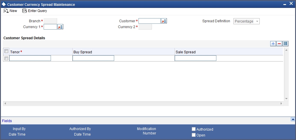 For a given customer and currency pair, you can define buy and sell spreads in different tenors (in days). The system defaults the spread to zero if you have not maintained any spread for a customer.