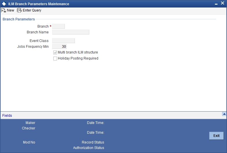 You can invoke the ‘ILM Branch Parameter Maintenance’ screen by typing ‘ILDBRPRM’ in the field at the top right corner of the Application tool bar and clicking on the adjoining arrow button.