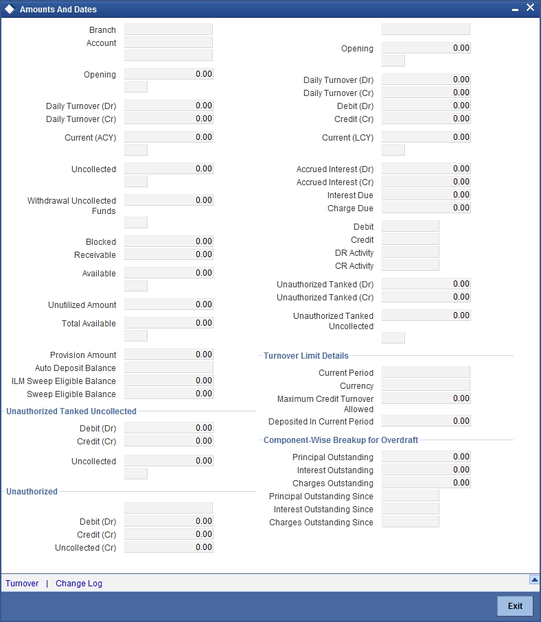 Click on ‘Amounts & Dates’ section in ‘Customer Account Maintenance’ screen to view the current days Sweep Eligible Balance which is available for Sweep Out/ Interest Calculation.