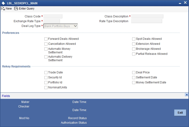 As a cross-checking mechanism to ensure that the right deal is invoked for authorization, you can specify that the values of certain fields should be entered, before the other details are displayed. The complete details of the deal will be displayed only after the values to these fields are entered. The fields for which the values have to be given are called the re-key fields.