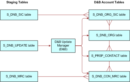Overview of the Update ProcessThis topic outlines the process of loading D&B data from the staging tables to the D&B Account tables through to updating the Siebel account tables. This process recommends using the D&B Update Manager MultiTask server component to run server component tasks in parallel. However, use of the single task D&B Update Manager (D&B) and D&B Update Manager (Siebel) server components is also documented in this chapter.