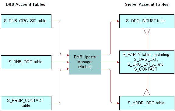 Siebel Applications Administration Guide > D&B Integration > Integrating D&B Data > About Siebel Update Server ComponentsWhen you load or reload D&B data, you must update the D&B Account tables and the Siebel Account tables in the Siebel database. This update is accomplished by running server components: