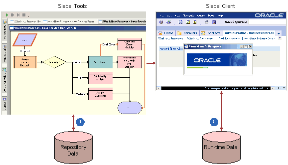Siebel Business Process Framework: Workflow Guide > Architecture That Siebel Workflow Uses > About the Architecture of a Workflow Process > Architecture You Use to Simulate a Workflow ProcessYou can use the Process Simulator to test a workflow process. Testing your workflow process before you migrate it to the production environment makes sure that it works correctly and that the results meet your business requirements. Figure 4 describes the architecture that you use to simulate a workflow process. Explanation of CalloutsYou use the following items to simulate a workflow process: