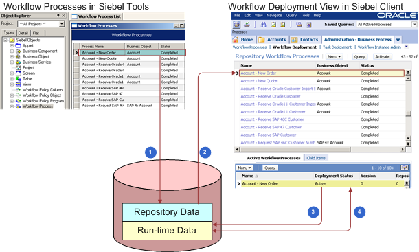 Figure 5 describes how you use Siebel Tools and the Siebel client to deploy a workflow process. Explanation of Callouts |