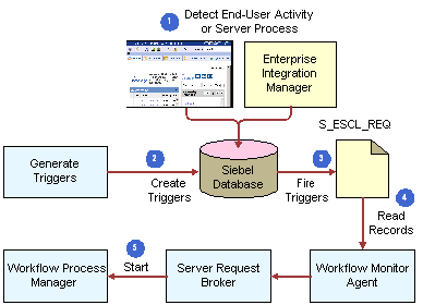 3. Fire Triggers. Siebel CRM queues the S_ESCL_REQ table.